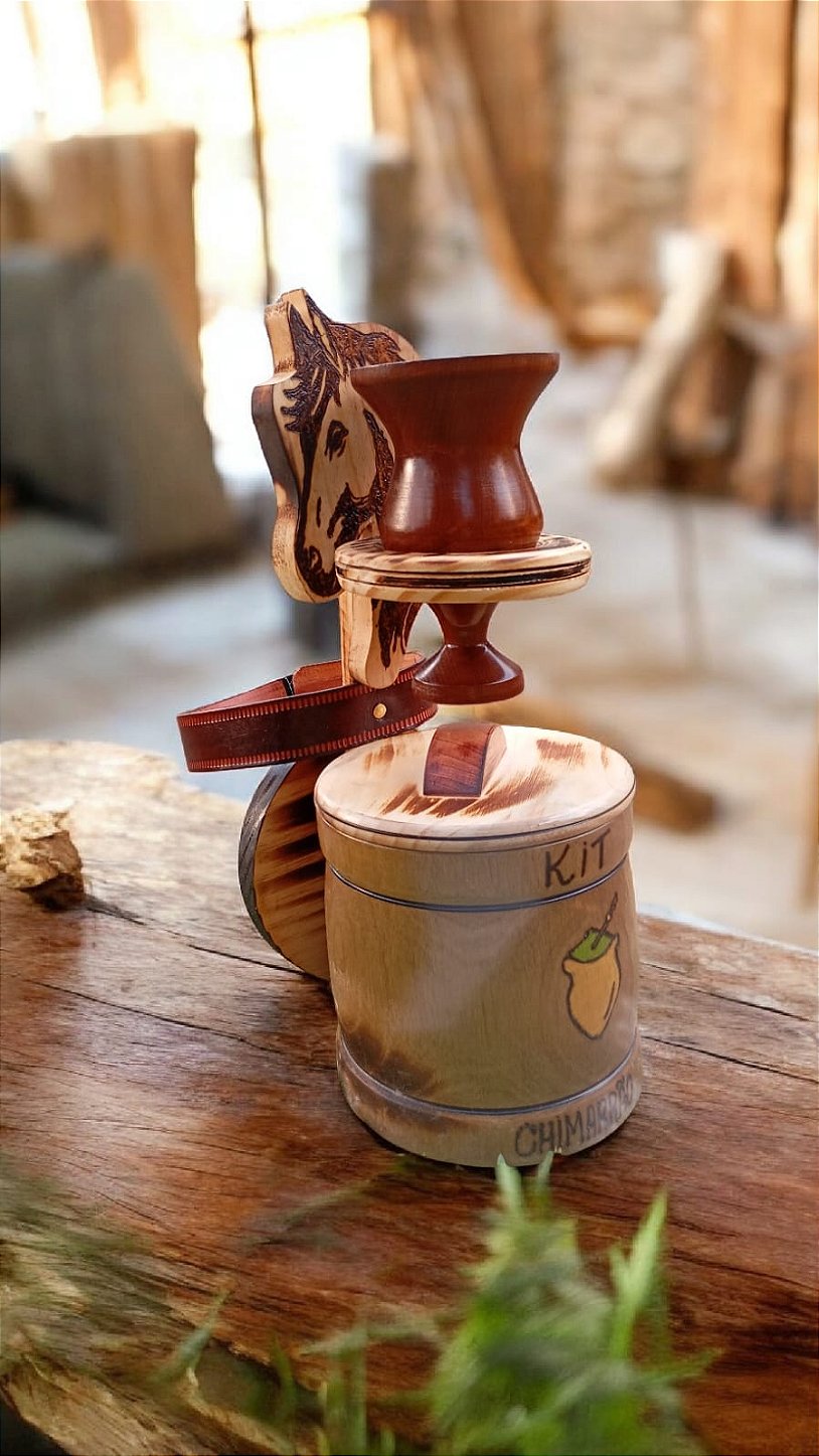 Um kit artesanal completo para quem aprecia o chimarrão com estilo rústico e tradicional. Ideal para preparar a bebida de forma prática e elegante.